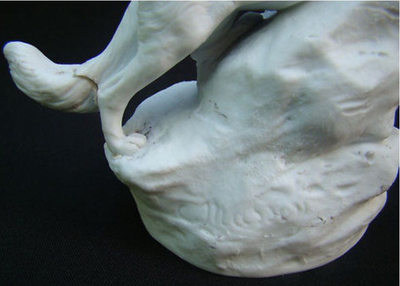 Une patte du renard présentait un fêle et sa queue était cassée en deux. On a choisi une restauration illusionniste afin de restituer au sujet son harmonie initiale. L'important pour cette pièce était de reproduire l'aspect mat du biscuit.